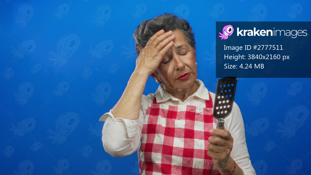 Senior woman with grey hair in apron examines spatula against vibrant blue background while contemplating cooking.