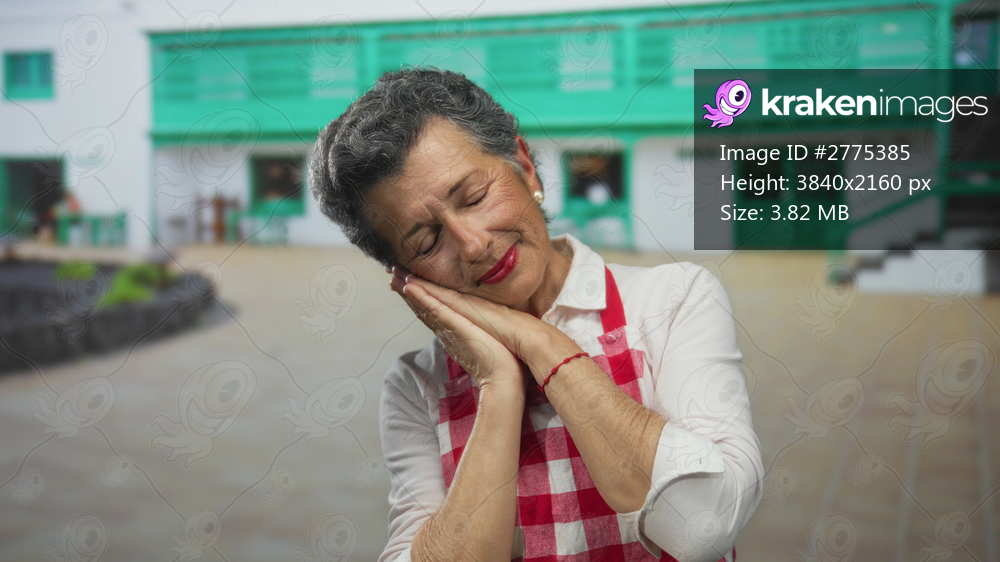 Senior woman with grey hair in apron making sleep gesture on an urban street in an old town setting, expressing relaxation and comfort outdoors.