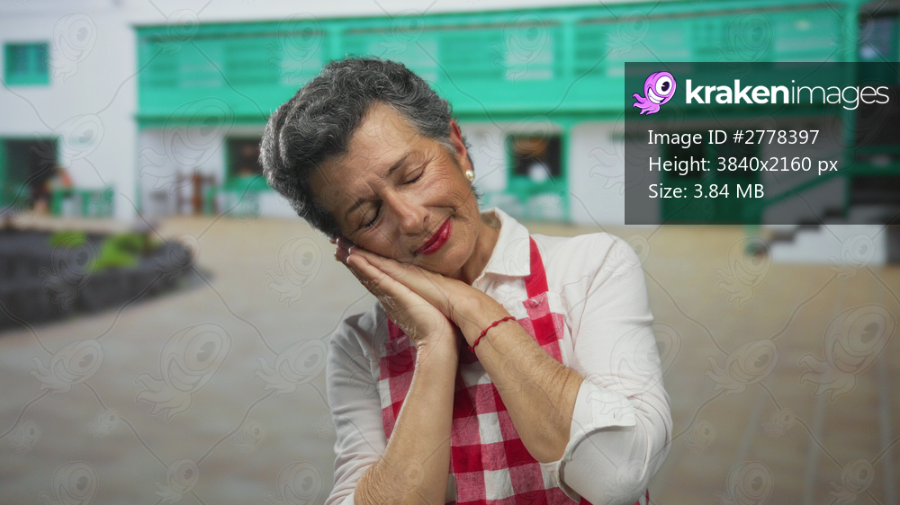 Senior woman with grey hair in apron making sleep gesture on an urban street in an old town setting, expressing relaxation and comfort outdoors.