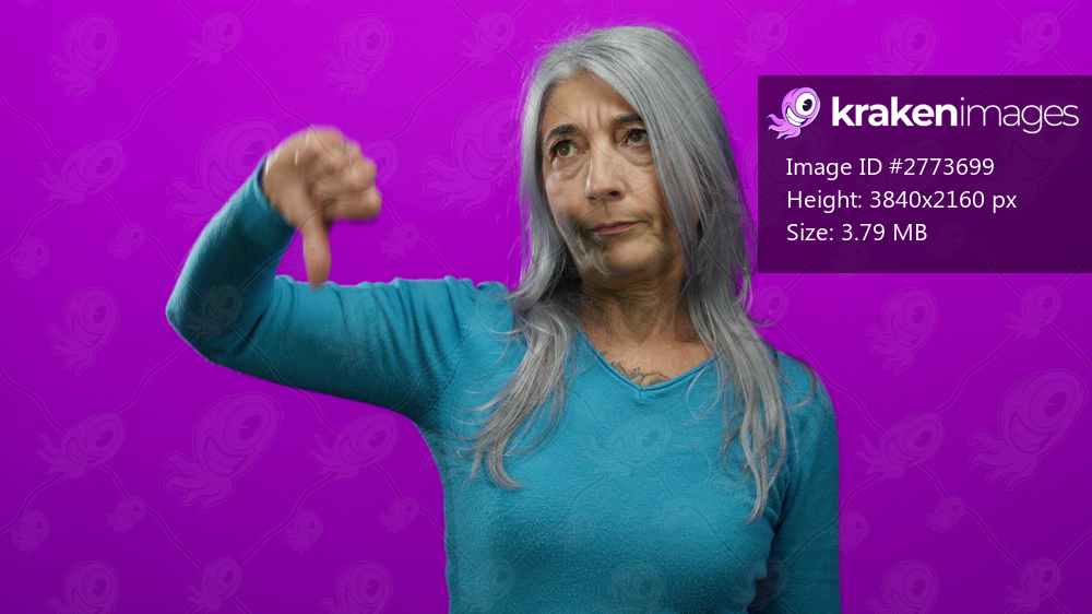 Senior woman with grey hair in blue shirt giving thumbs down gesture standing against isolated pink wall background with expressive look.
