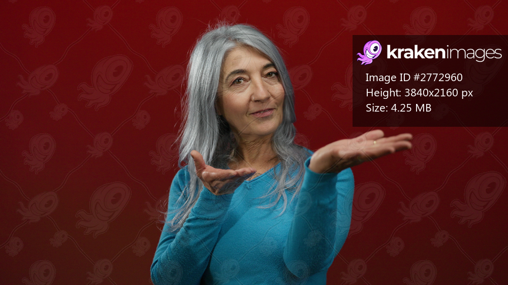 Senior woman with grey hair in blue sweater extends hands against red wall background, presenting with a friendly smile in an isolated studio shot.