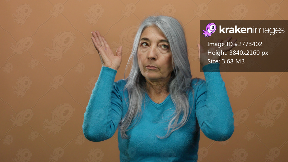Senior woman with grey hair in blue sweater isolated against brown background expressing surprise with hands raised.