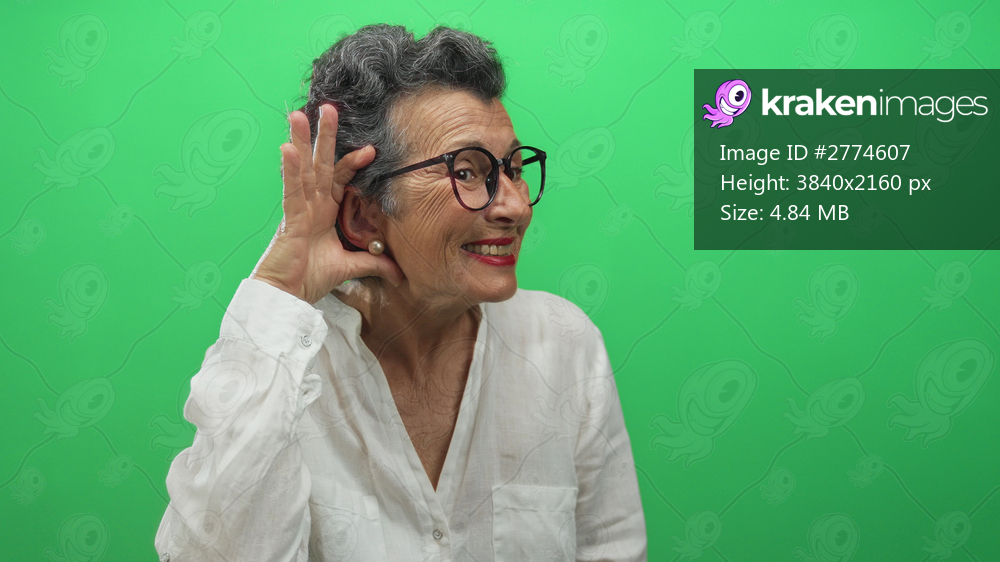 Senior woman with grey hair in glasses gestures listening with hand to ear against a vibrant green background, wearing a white shirt and smiling warmly. - Kraken Images