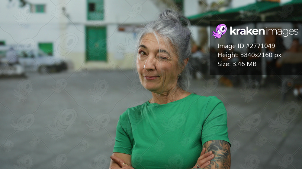 Senior woman with grey hair in green shirt on restaurant terrace smiles confidently in an outdoor street setting enjoying a relaxed day outside.