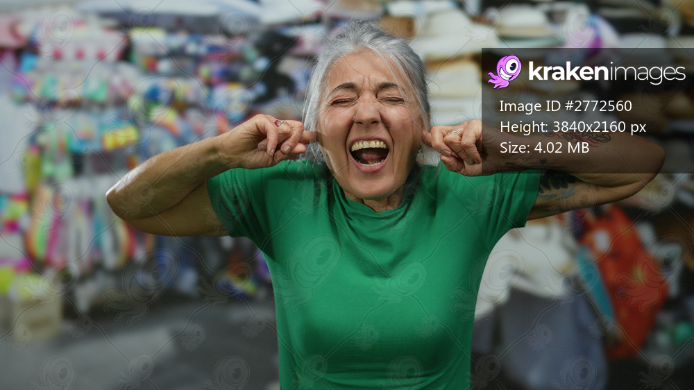 Senior woman with grey hair in green shirt screaming and covering ears in colorful market with shopping background.