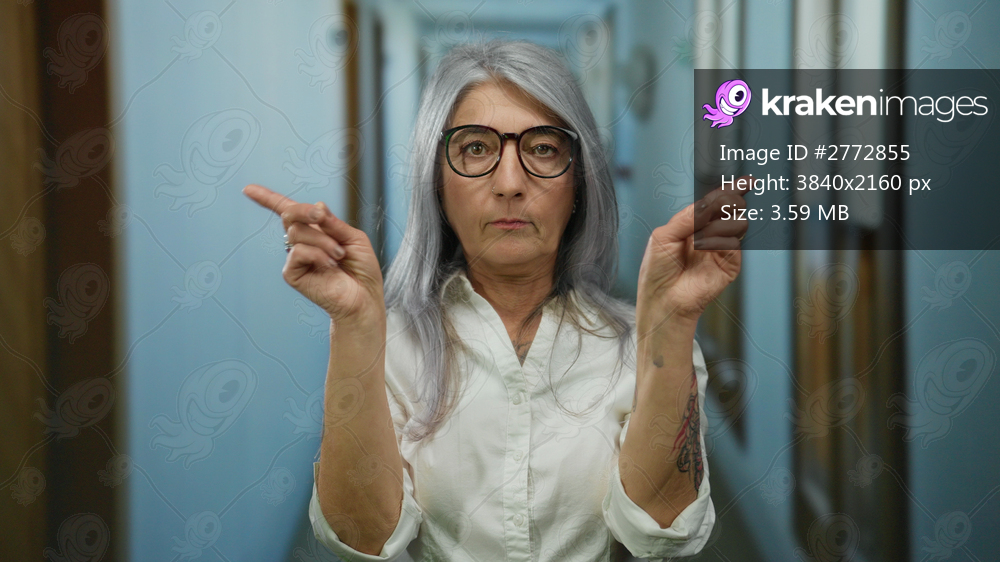 Senior woman with grey hair in hotel corridor signaling no with fingers and focused expression, wearing glasses and white shirt, suggesting negative response or disapproval indoors. - Kraken Images