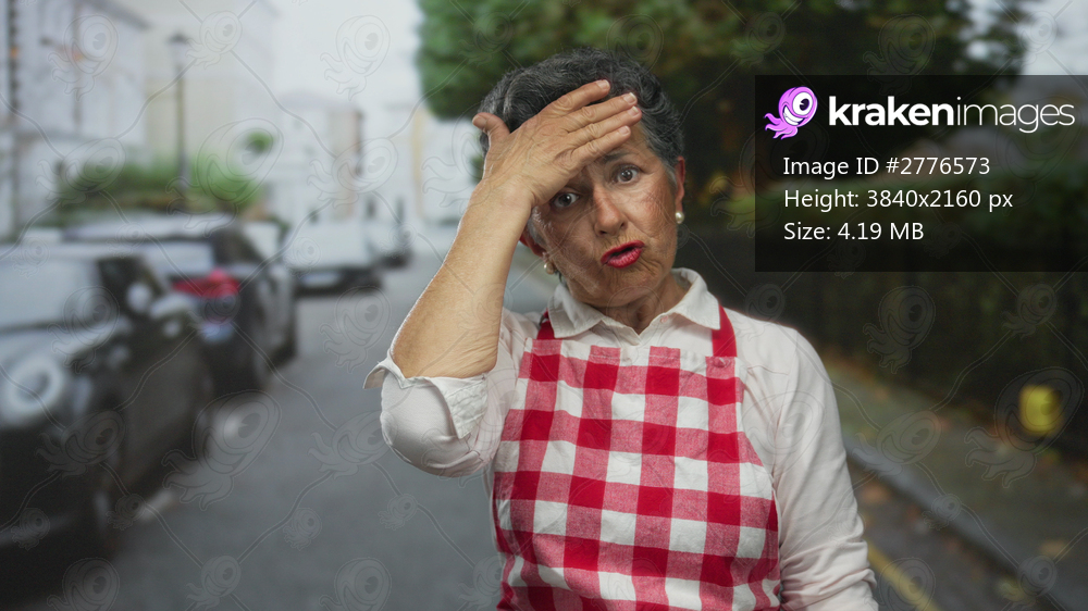 Senior woman with grey hair in red check apron looks worried outdoors on a city street, surrounded by urban buildings and parked cars, evoking a sense of concern and reflection. - Kraken Images