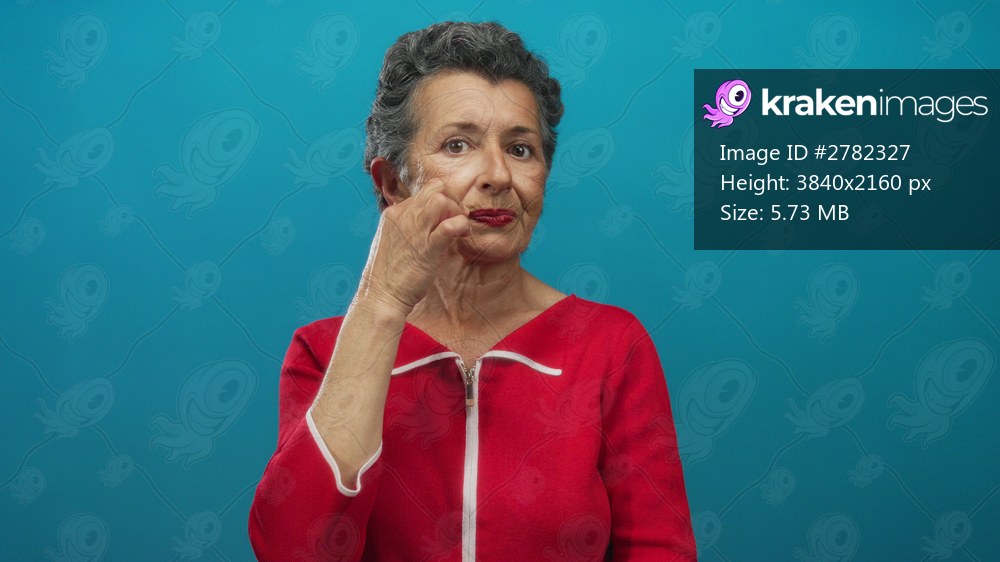 Senior woman with grey hair in red clothing making a gesture to close mouth and lock with key against blue background.