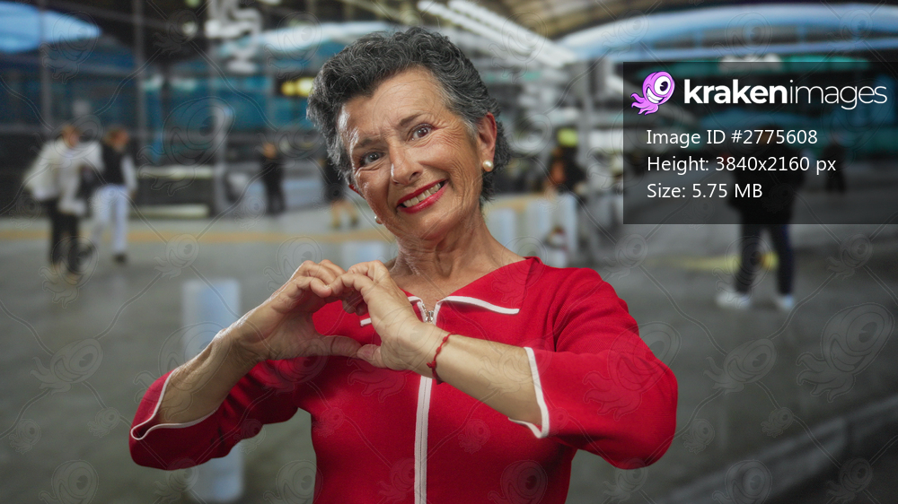 Senior woman with grey hair in red clothing making a heart shape with hands at an airport outdoor setting with people and structures in the background. - Kraken Images