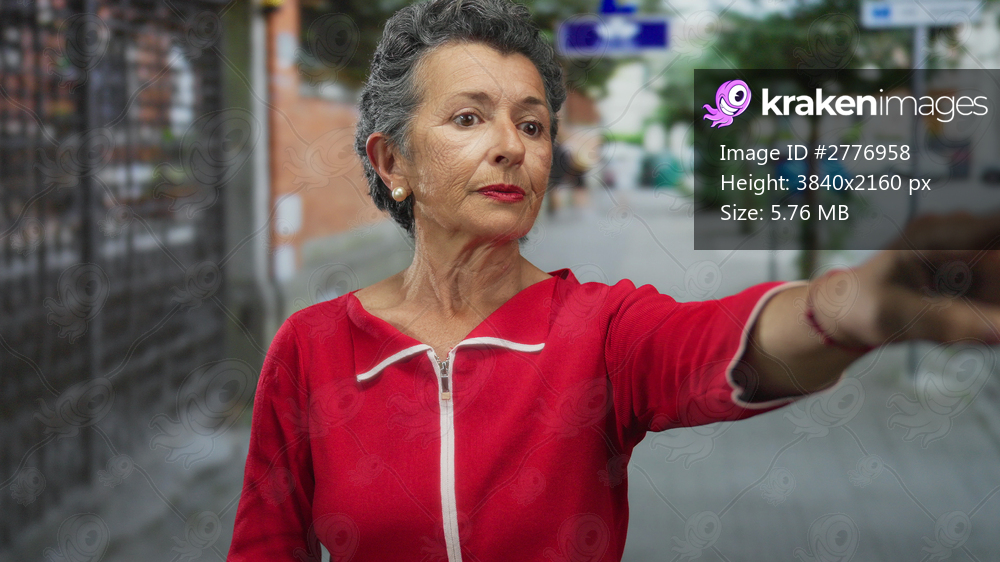 Senior woman with grey hair in red clothing pointing on a city street during the day.