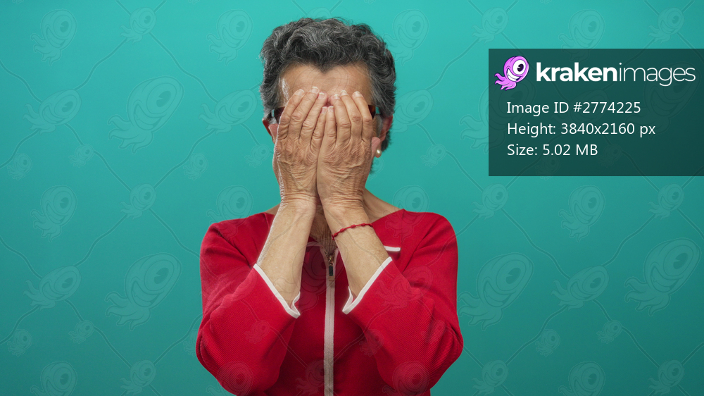 Senior woman with grey hair in red outfit expressing surprise and playfulness with hand gestures and tongue out against a vibrant green background.