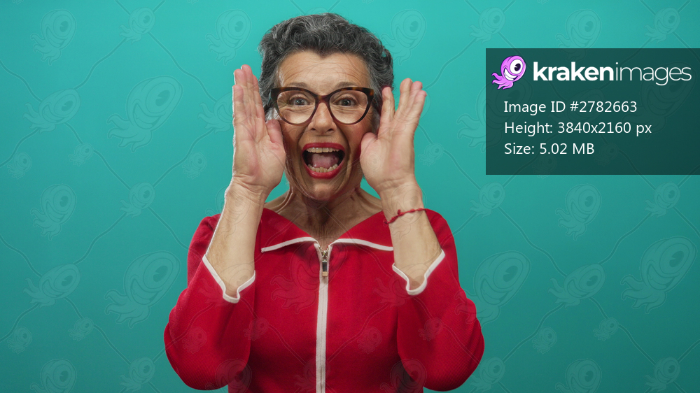 Senior woman with grey hair in red outfit expressing surprise and playfulness with hand gestures and tongue out against a vibrant green background.