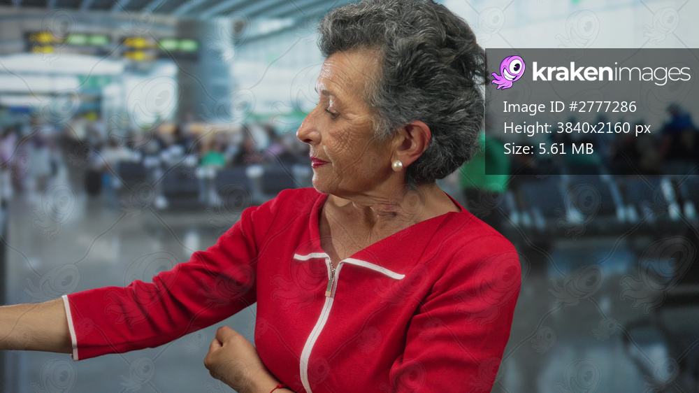 Senior woman with grey hair in red outfit making gesture at busy indoor airport terminal with blurred background of travelers and signs.