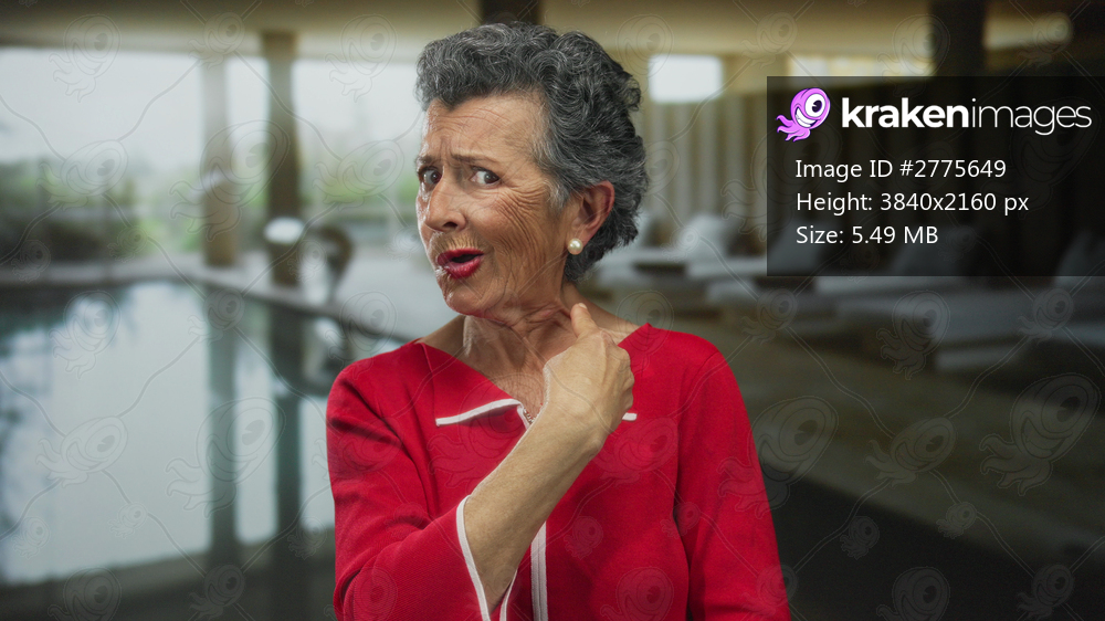 Senior woman with grey hair in red shirt appears puzzled next to an indoor pool at a spa, suggesting a moment of uncertainty or curiosity in a luxurious setting. - Kraken Images
