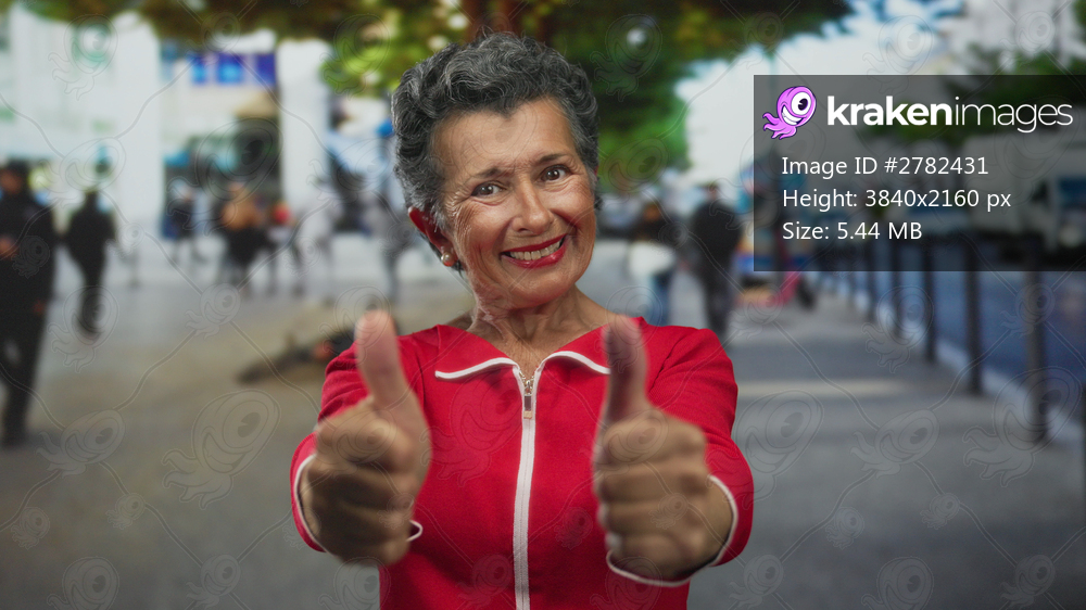 Senior woman with grey hair in red sweater giving thumbs up on a busy urban street, embodying positivity and happiness in a city setting.