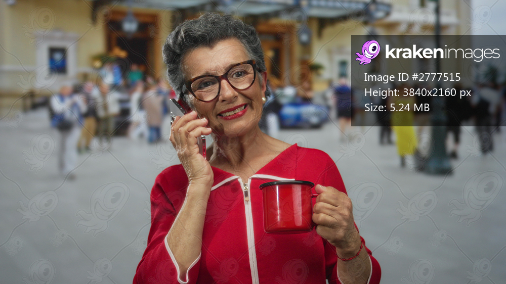 Senior woman with grey hair in red top, smiling while holding a coffee cup and talking on phone, standing on an urban street with blurred crowd in the background. - Kraken Images
