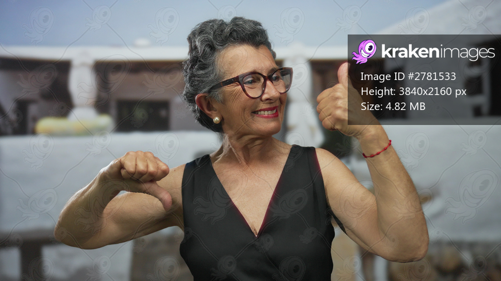 Senior woman with grey hair in urban setting showing thumbs up and thumbs down, wearing glasses and smiling outdoors in a city environment.