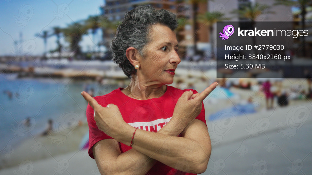 Senior woman with grey hair in volunteer shirt joyfully points in opposite directions on a lively seaside promenade filled with beachgoers and palm trees. - Kraken Images