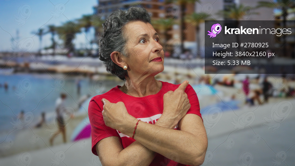 Senior woman with grey hair in volunteer shirt joyfully points in opposite directions on a lively seaside promenade filled with beachgoers and palm trees. - Kraken Images