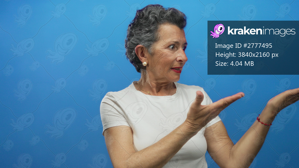 Senior woman with grey hair in white shirt gesturing on blue background, expressing intrigue and curiosity.