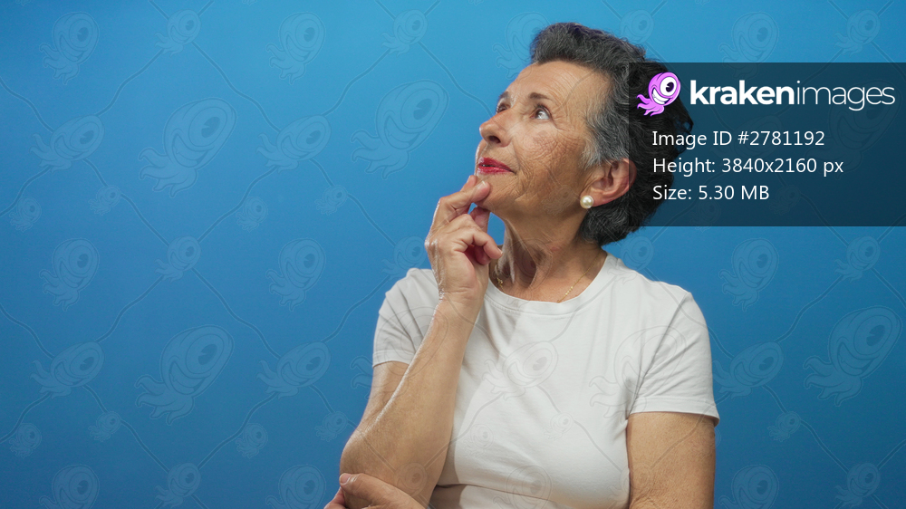 Senior woman with grey hair in white shirt thinking against blue background, expressing contemplation and curiosity with a thoughtful pose and a gentle smile. - Kraken Images
