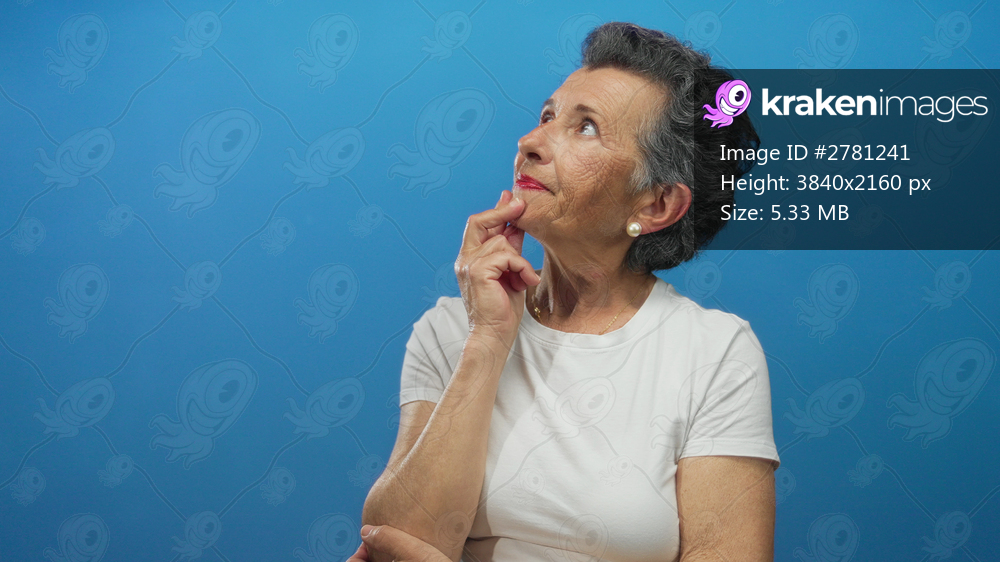 Senior woman with grey hair in white shirt thinking against blue background, expressing contemplation and curiosity with a thoughtful pose and a gentle smile. - Kraken Images