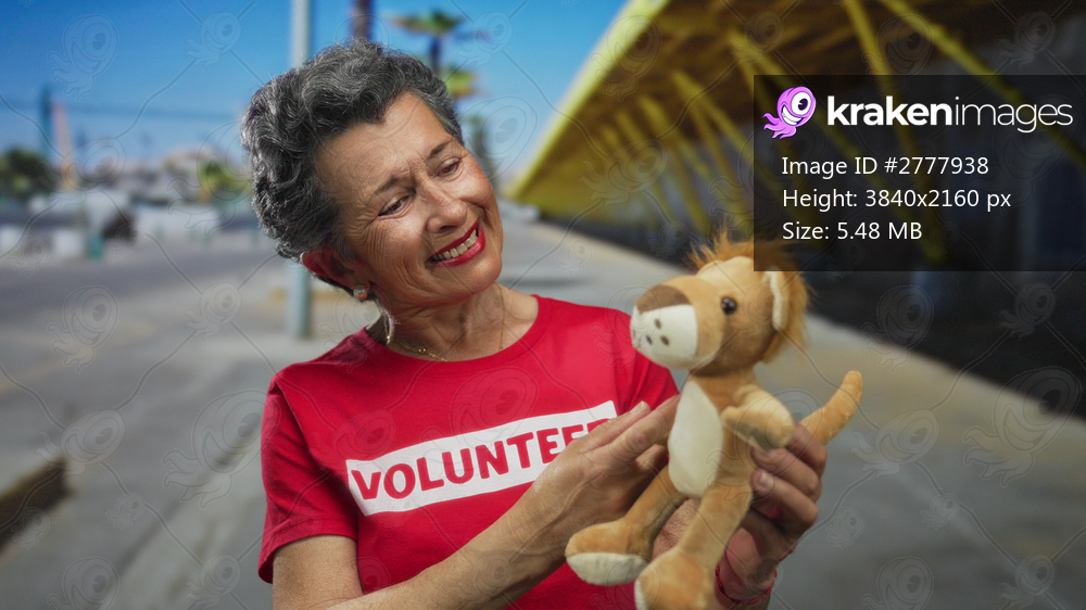 Senior woman with grey hair joyfully engages with a stuffed animal while wearing a volunteer shirt, standing in an urban street environment, displaying community spirit. - Kraken Images