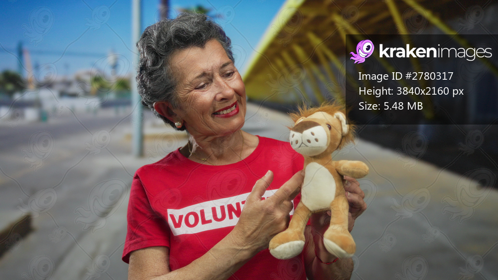 Senior woman with grey hair joyfully engages with a stuffed animal while wearing a volunteer shirt, standing in an urban street environment, displaying community spirit. - Kraken Images