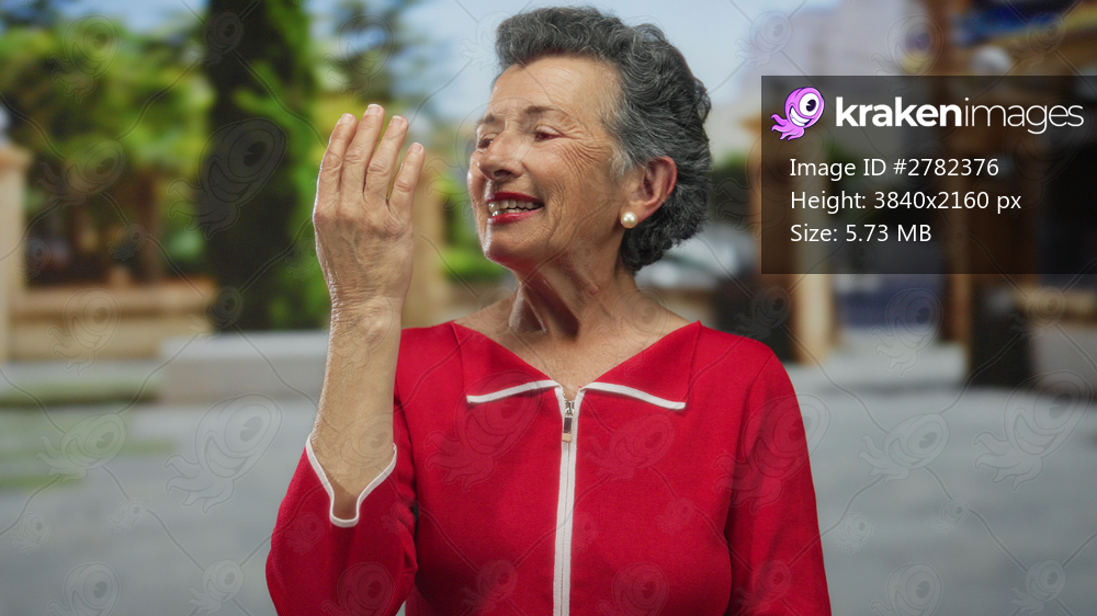 Senior woman with grey hair joyfully gesturing outdoors in an old town street, wearing a red dress, smiling, embodying happiness and nostalgia in a charming urban setting. - Kraken Images
