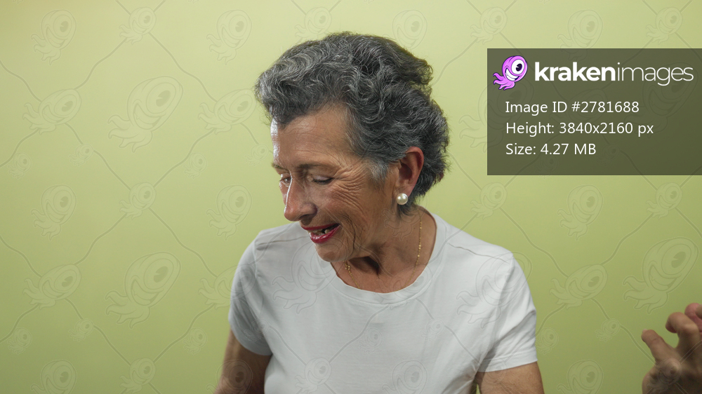 Senior woman with grey hair joyfully mimics playing guitar in white shirt against bright yellow background, showcasing lively spirit and energy.