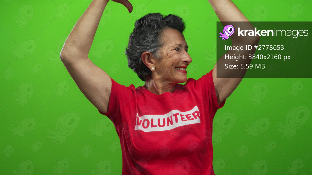 Senior woman with grey hair joyfully raising arms in red volunteer shirt with green background showcasing happiness and community spirit