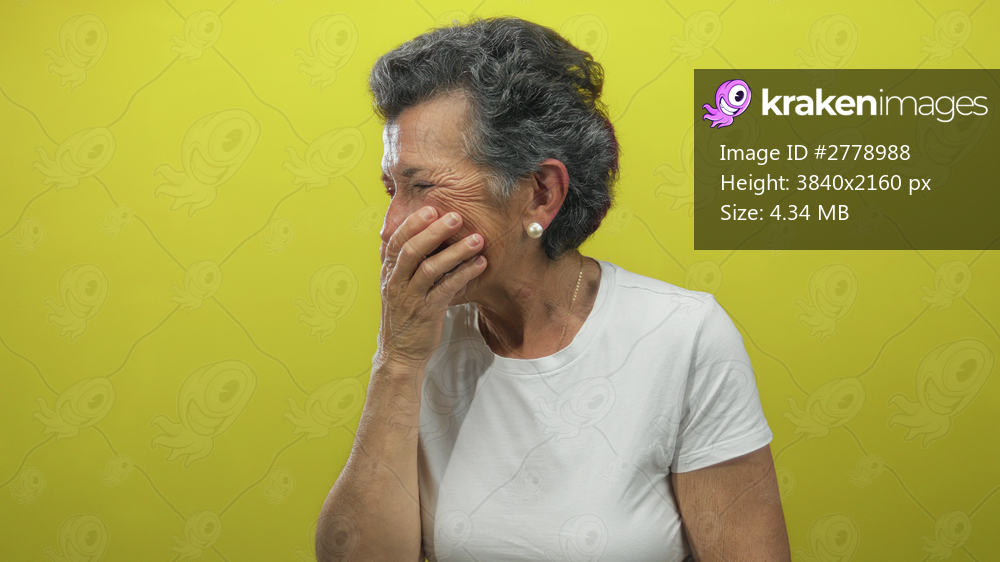 Senior woman with grey hair laughing joyfully and covering her mouth, standing against a vivid yellow background, wearing a white shirt, expressing happiness and positivity. - Kraken Images