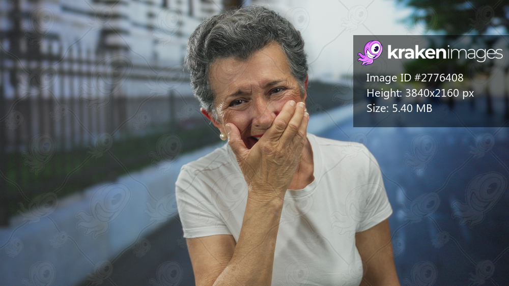 Senior woman with grey hair laughing outdoors on a city street, covering her mouth with her hand, exuding joy in a vibrant urban setting.