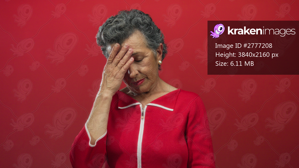Senior woman with grey hair looking concerned against a vivid red background, capturing emotion and age with closed eyes and hand on forehead.