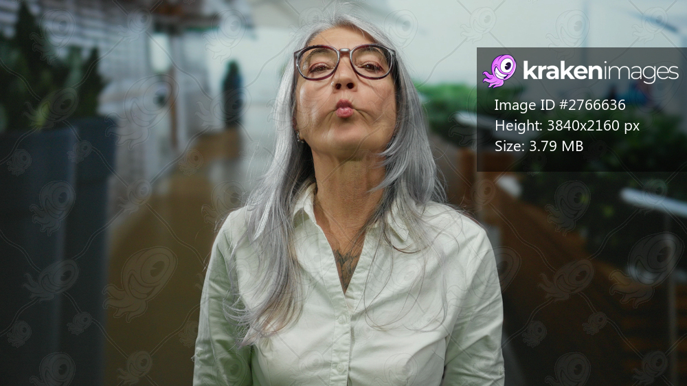 Senior woman with grey hair makes a humorous face on a bustling outdoor street, surrounded by blurred people and greenery, wearing glasses and a white shirt. - Kraken Images