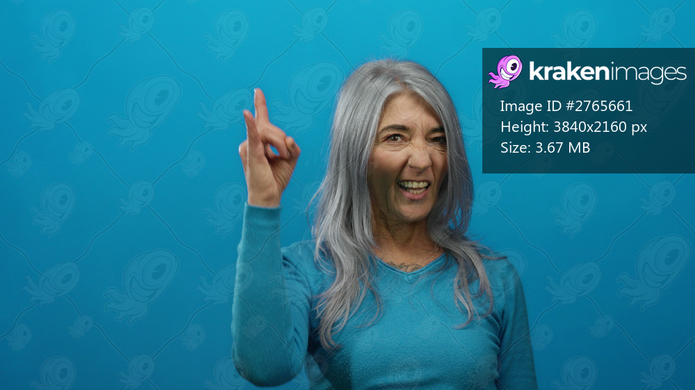 Senior woman with grey hair makes a rock gesture, standing against an isolated blue background wall, projecting confidence and energy.