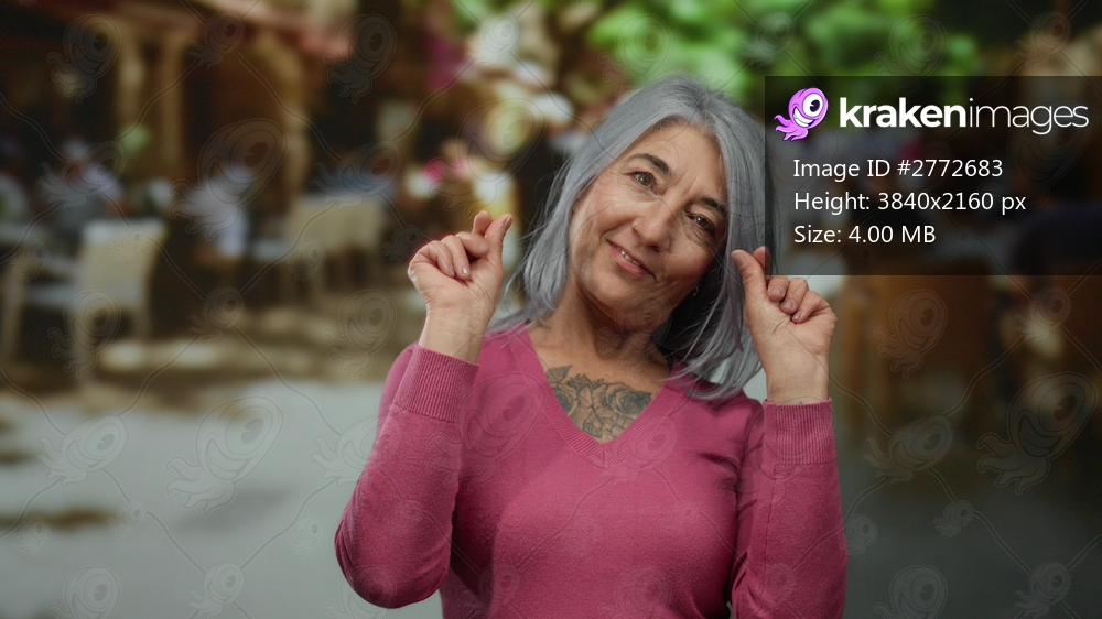 Senior woman with grey hair makes money gesture on outdoor restaurant terrace.