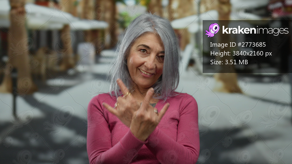 Senior woman with grey hair makes rock gesture outdoors on a sunny street, wearing a pink sweater and smiling with a confident and happy expression.