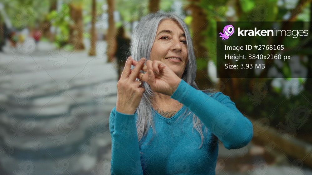 Senior woman with grey hair making a hashtag gesture on a lively outdoor street with lush greenery and people in the background.
