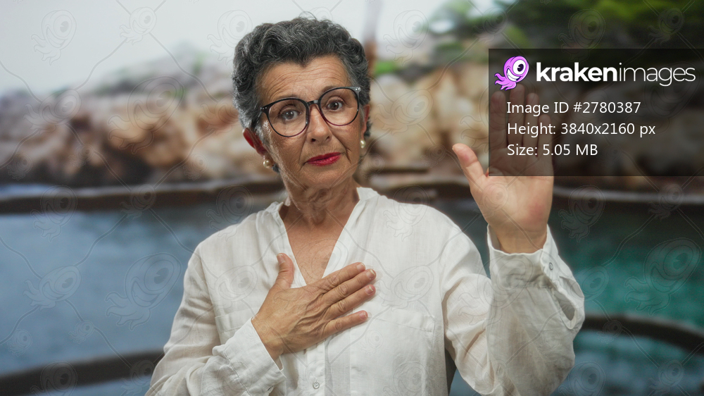 Senior woman with grey hair making a pledge gesture near the seaside, standing on a sunny promenade with vibrant ocean background, embodying confidence and wisdom in a peaceful beach setting. - Kraken Images