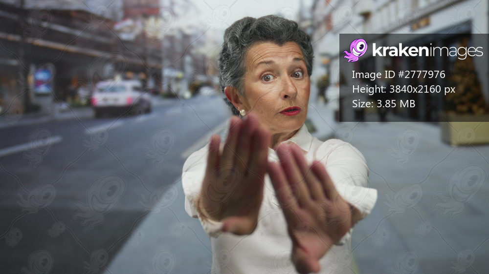 Senior woman with grey hair making a stop gesture on a city street, wearing a white shirt, depicting caution and emphasis in an urban town environment outdoors. - Kraken Images