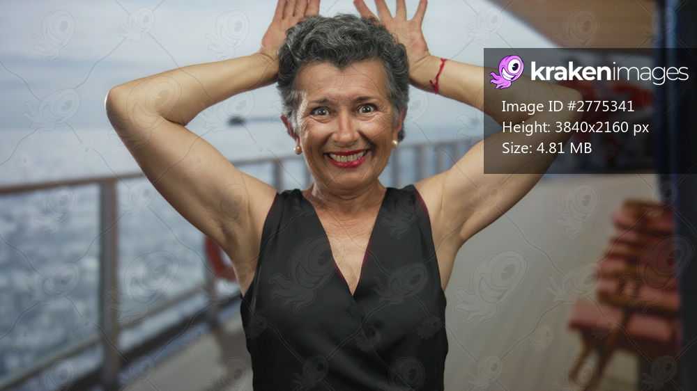 Senior woman with grey hair making bunny ears gesture on a boat outdoors with the sea in the background and a joyful expression.