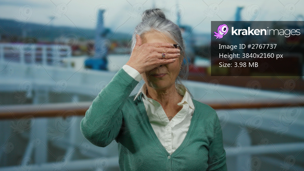 Senior woman with grey hair on boat at seaside port, smiling with one hand covering face against industrial backdrop.