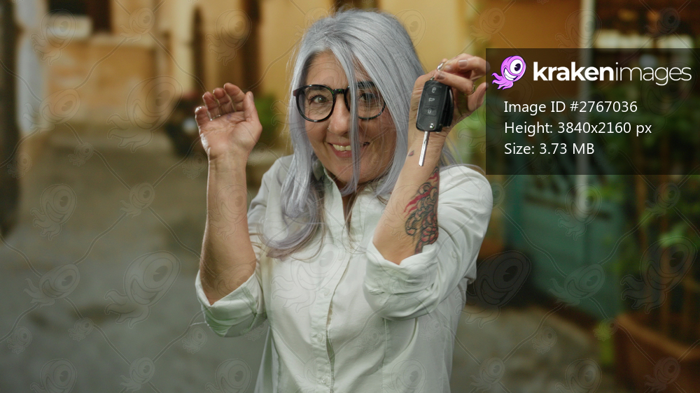 Senior woman with grey hair playfully holding car keys in one hand and waving on a charming outdoor street, sporting glasses and a smile, suggesting a lighthearted moment. - Kraken Images