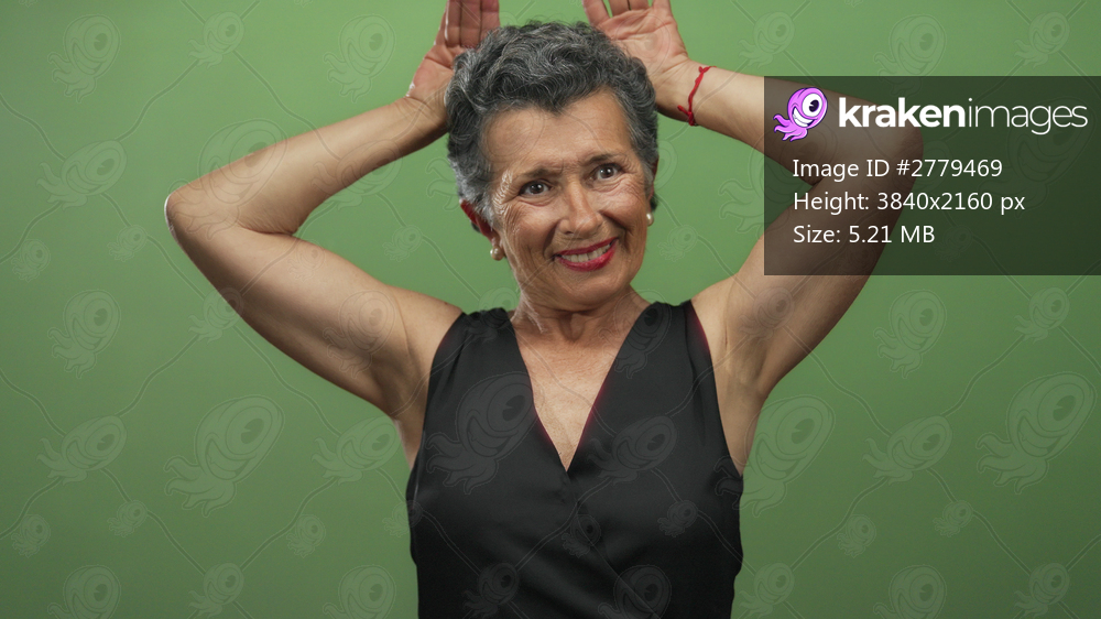 Senior woman with grey hair playfully makes bunny ears against a green background, smiling joyfully with arms raised, showcasing a fun and lighthearted expression in a vibrant setting. - Kraken Images