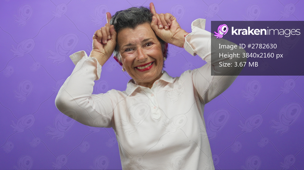 Senior woman with grey hair playfully making horns gesture against a vibrant purple background, showcasing a fun and joyful expression.