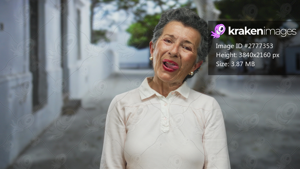Senior woman with grey hair playfully posing on an urban street, blending warmth and charm in a lively city scene.