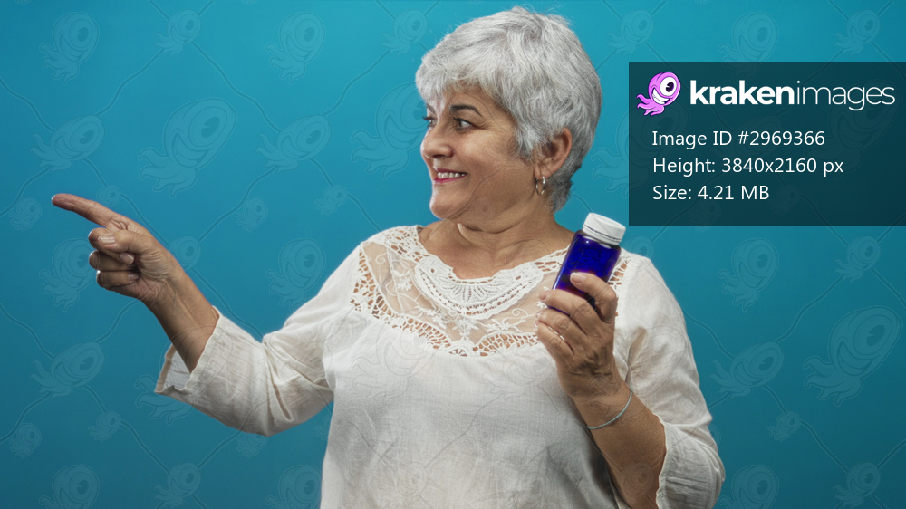 Senior woman with grey hair and plus size holding a blue medicine bottle points finger and smiles in studio; wellness confidence.