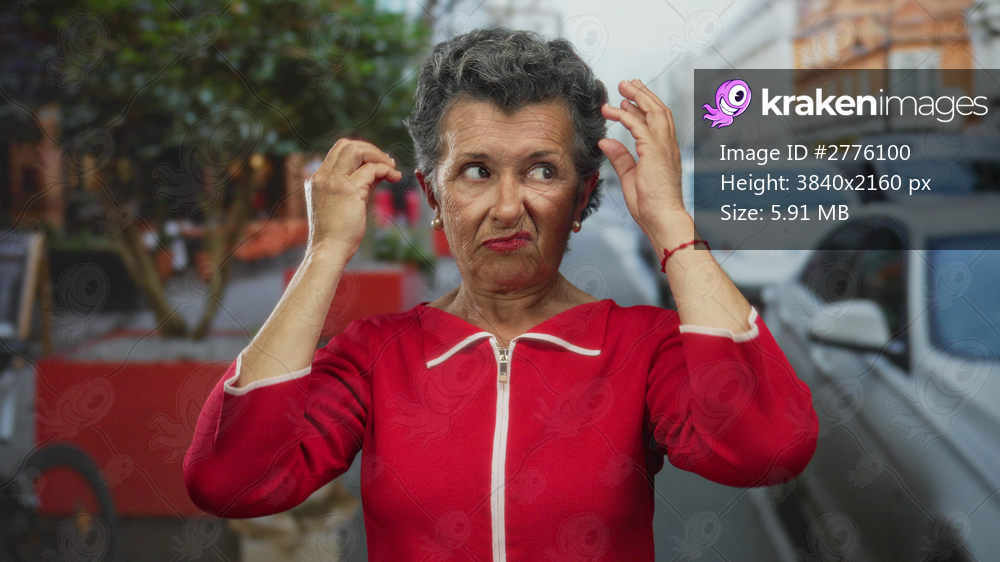 Senior woman with grey hair and red attire styles her hair with hands while standing outdoors on a busy urban street scene, displaying emotion with expressive face. - Kraken Images