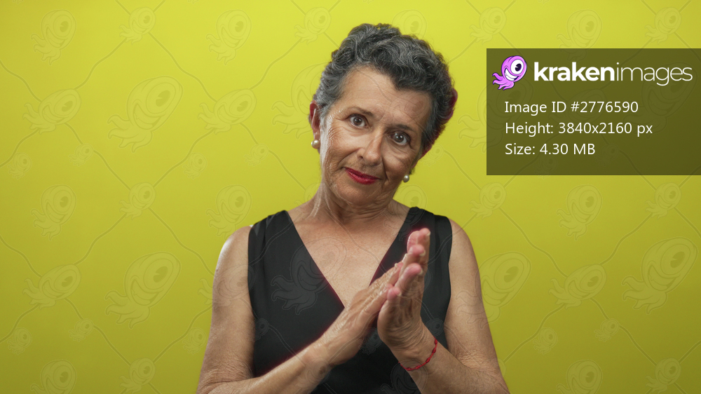 Senior woman with grey hair and red lips clapping, smiling in front of a vibrant yellow background creates a joyful and engaging scene emphasizing positivity and celebration. - Kraken Images
